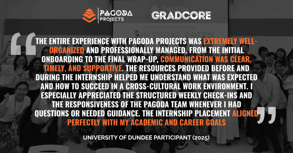 On the first day of your programme, you will have a detailed orientation to make sure you are clear on details of your programme, how to complete your internship plan with you supervisor and how to reach out to the team. Throughout the programme you will be able to check-in with the Pagoda team and offer any support required.